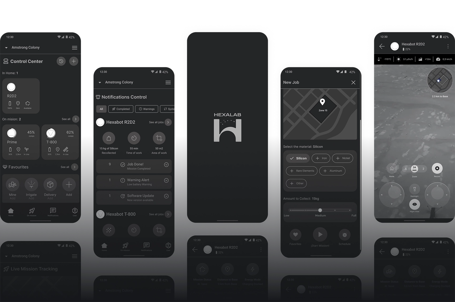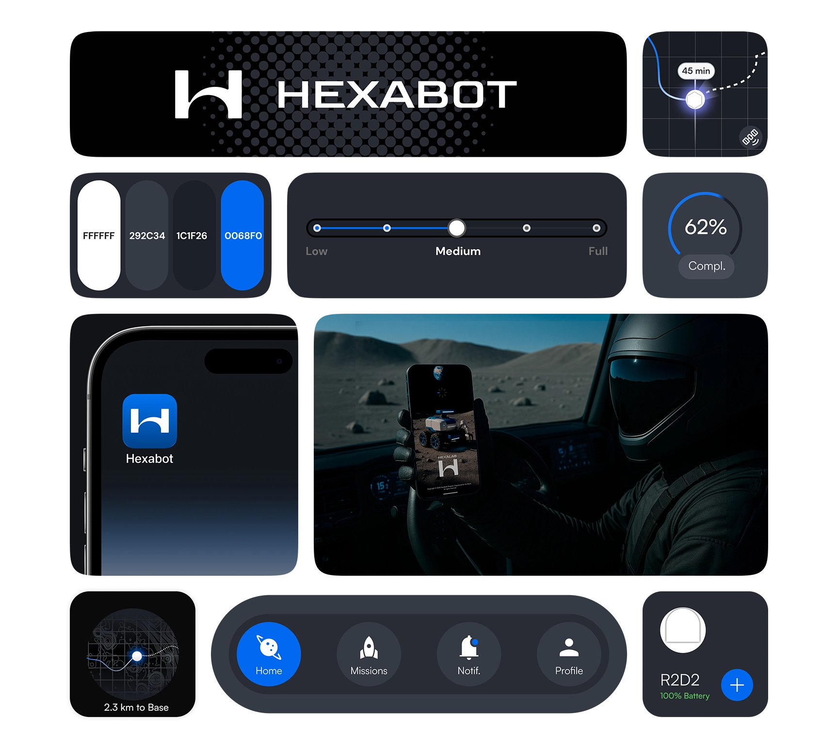 Este proyecto nace como respuesta al reto planteado por Designflows 2025, un concurso europeo de diseño UI organizado por Bending Spoons, centrado en la creación de experiencias digitales realistas. La consigna consistía en diseñar una aplicación para gestionar Hexabots — robots autónomos desplegados en una colonia lunar para tareas de exploración, mantenimiento y recolección de recursos.